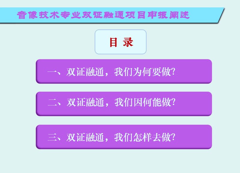 近年來,東方電影學(xué)院不斷進(jìn)行教學(xué)改革,在提高教學(xué)質(zhì)量的基礎(chǔ)上,快速有效推進(jìn)“雙證融通”的進(jìn)程。“雙證融通”的基礎(chǔ)是繼續(xù)深化以任務(wù)引領(lǐng)為主要特征的課程改革,音像技術(shù)專業(yè)課程設(shè)置與內(nèi)容體系近年來也在不斷探索創(chuàng)新,基本上實現(xiàn)了課程改革的“任務(wù)引領(lǐng)”,為實現(xiàn)“雙證融通”奠定了重要的課程改革基礎(chǔ),并逐步形成了與職業(yè)資格證書內(nèi)容的對應(yīng)關(guān)系,具備了將職業(yè)資格證書中的知識、技能與素質(zhì)等內(nèi)容完全融入專業(yè)教學(xué)中的條件。