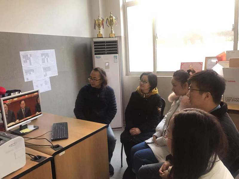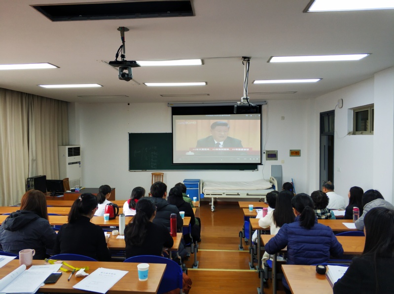 黨委中心組在學(xué)院會議室集中收看直播,各二級學(xué)院組織師生在各自辦公室和教室收看,還有通過手機(jī)觀看直播。下午上課的教師,在上課時也及時向同學(xué)宣講了大會的內(nèi)容。