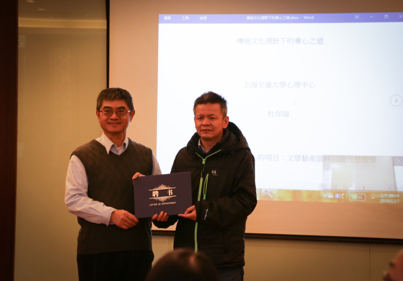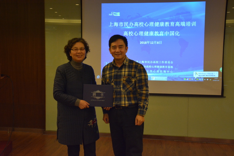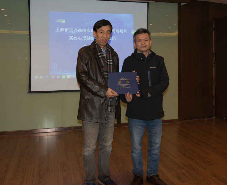 上海震旦職業(yè)學院黃晞建書記和夏臻副書記為上海交通大學心理咨詢中心楊文圣主任和汪國琴副主任頒發(fā)聘書。