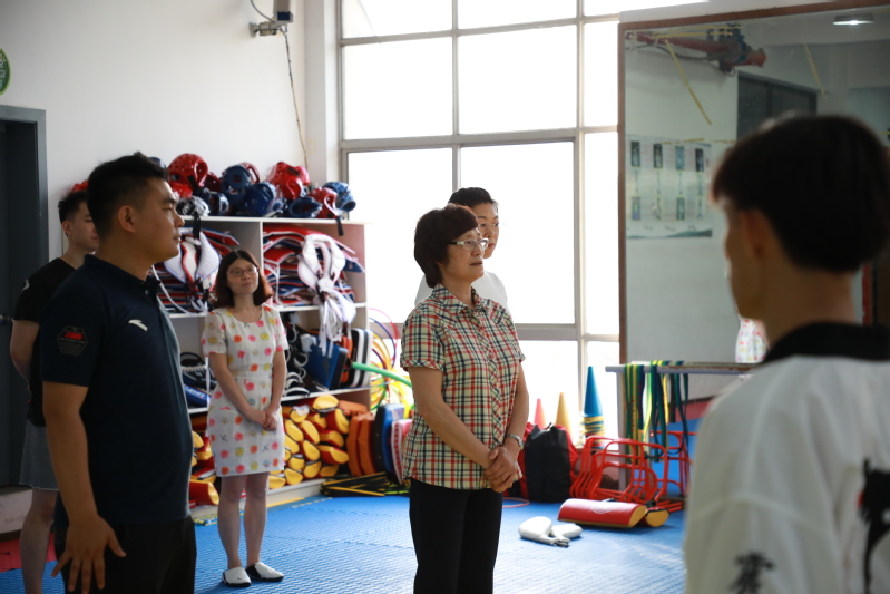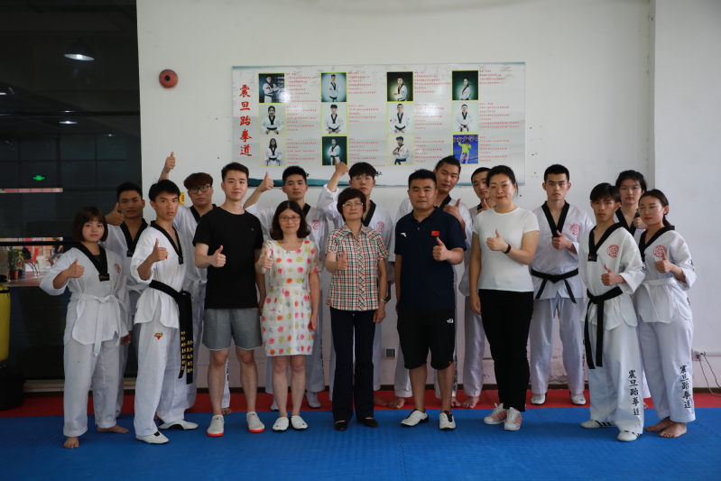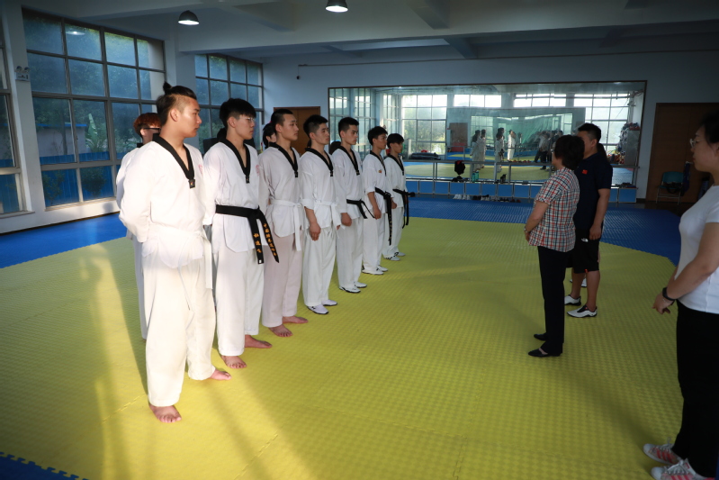 2019年6月5日下午五點(diǎn)半,就像幾百個(gè)日常訓(xùn)練中的一天一樣,體藝樓一樓外就能聽到跆拳道隊(duì)訓(xùn)練所發(fā)出的吶喊聲和響亮的腳靶擊打聲。當(dāng)天黨委副書記夏臻老師,黨委組織部部長黃敏老師,學(xué)生處處長毛燕靜老師,前往跆拳道館看望正在積極備戰(zhàn)全國大學(xué)生跆拳道錦標(biāo)賽的隊(duì)員們。
