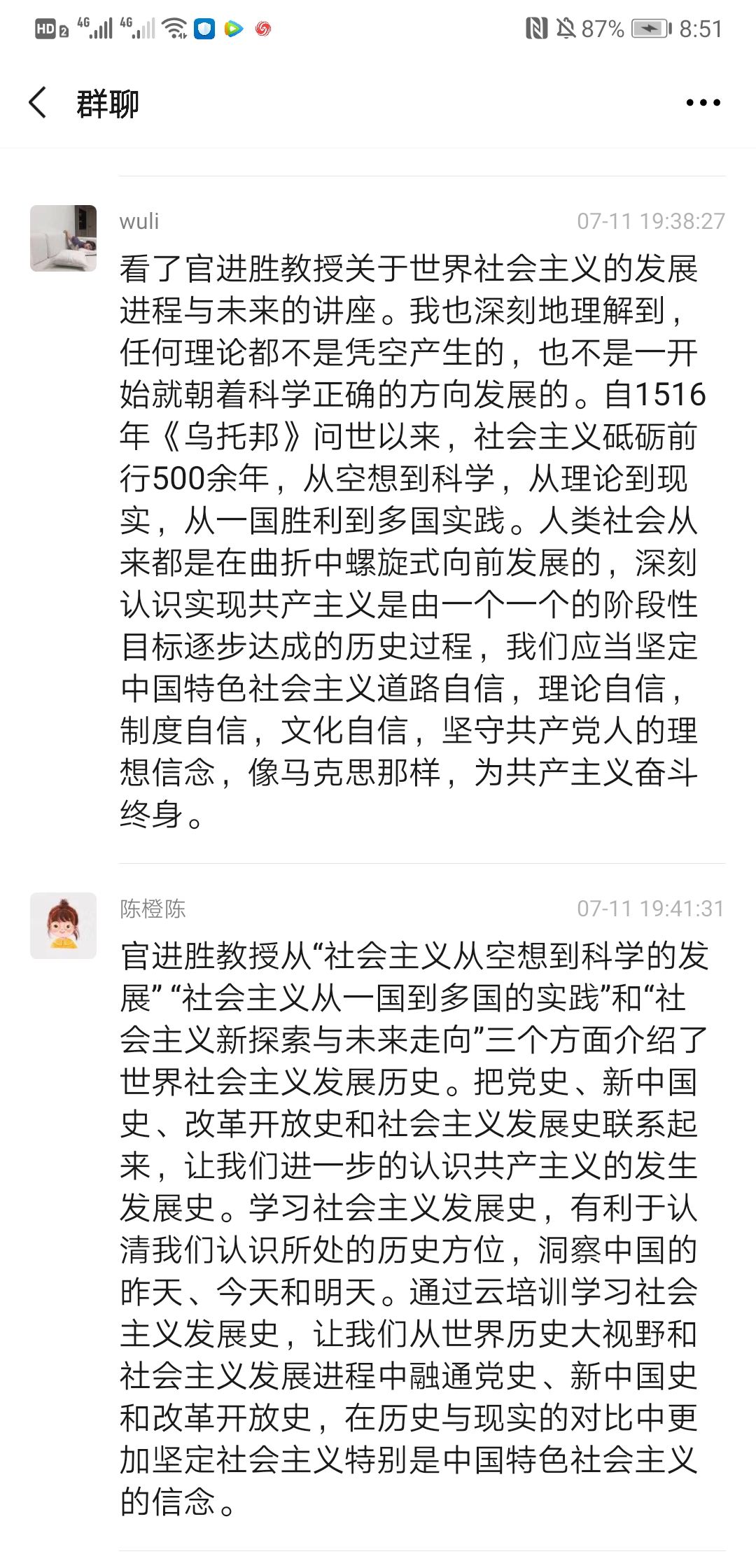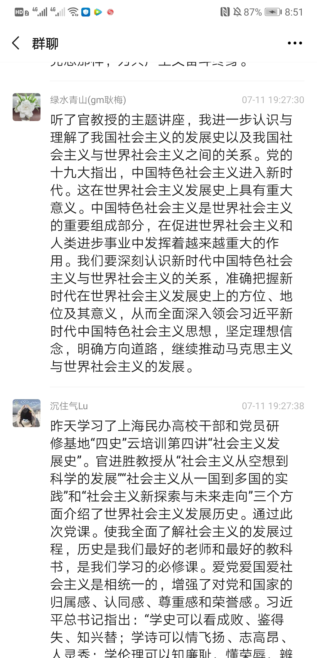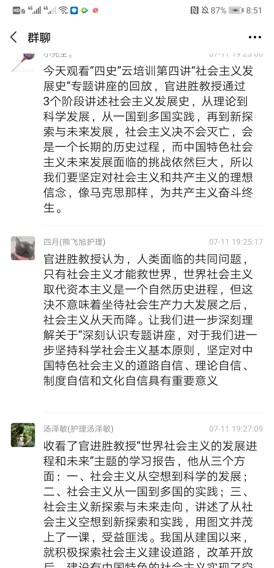 2020年7月10日上午9:30,上海民辦高校干部和黨員研修基地“四史”云培訓第四講“世界社會主義的發(fā)展進程與未來”專題講座準時開講,主講人是上海市委黨??茖W社會主義教研部主任官進勝教授。為加強師生黨員同志對社會主義發(fā)展史的認識和理解,公共衛(wèi)生與護理學院黨總支組織所有師生黨員收看了官教授的講座,并于11日晚19:00-20:00開展了一次線上研討會,共同探討本次講座的學習心得與體會,師生黨員同志們系統(tǒng)地回顧了世界社會主義的發(fā)展歷程,進一步加深了對社會發(fā)展規(guī)律的認識,增強了對中國走社會主義道路的決心和信心,對世界社會主義的美好前景充滿期待。以下是部分同志發(fā)言記錄: