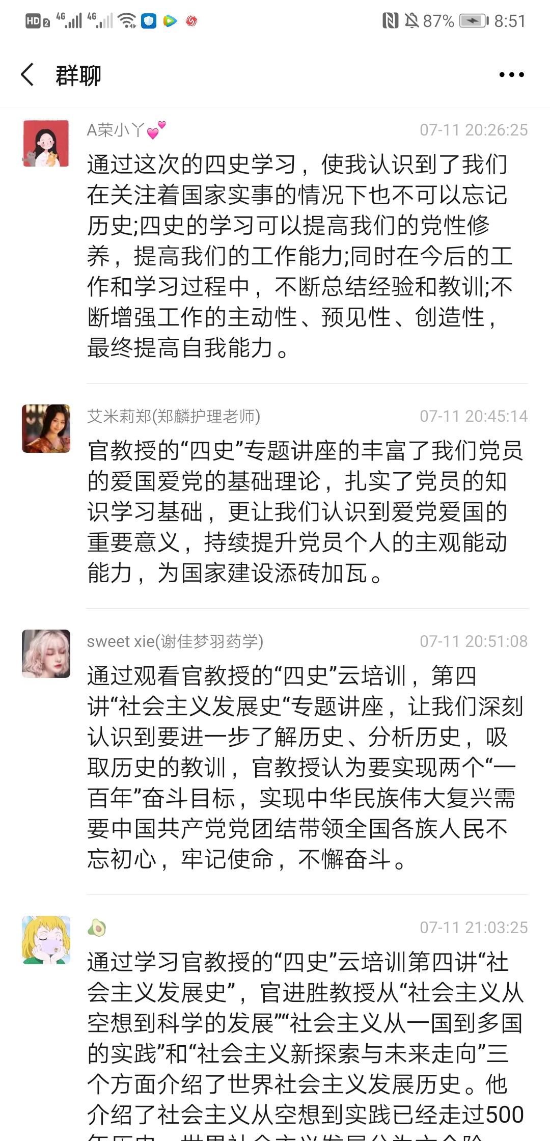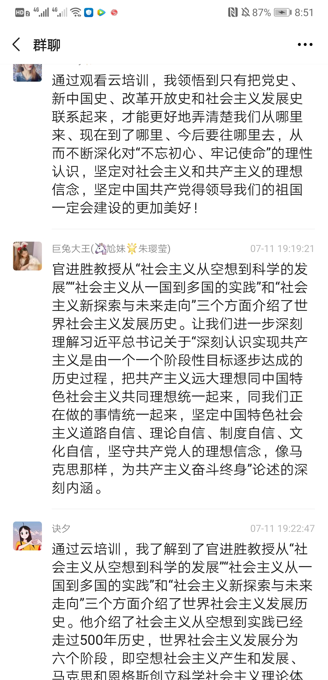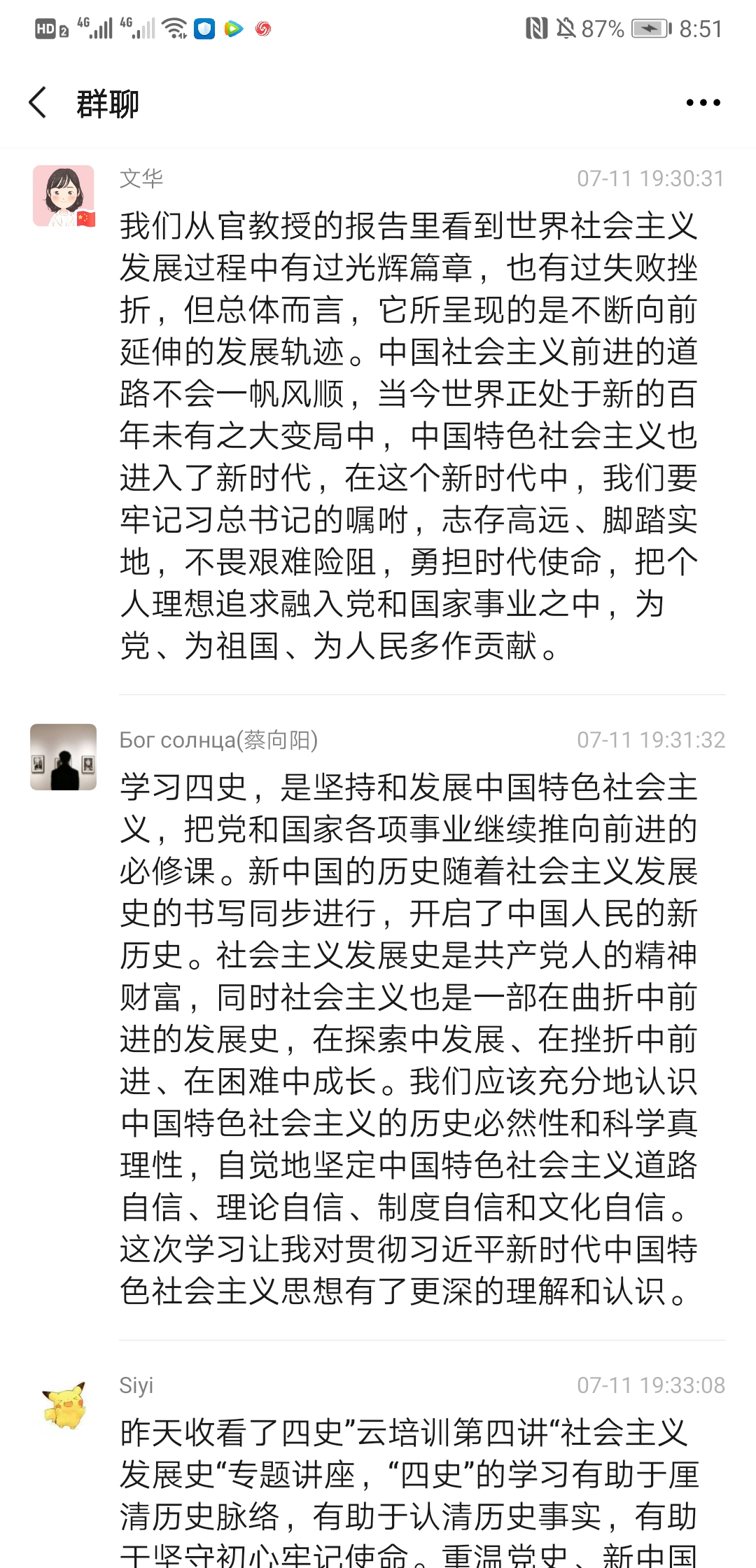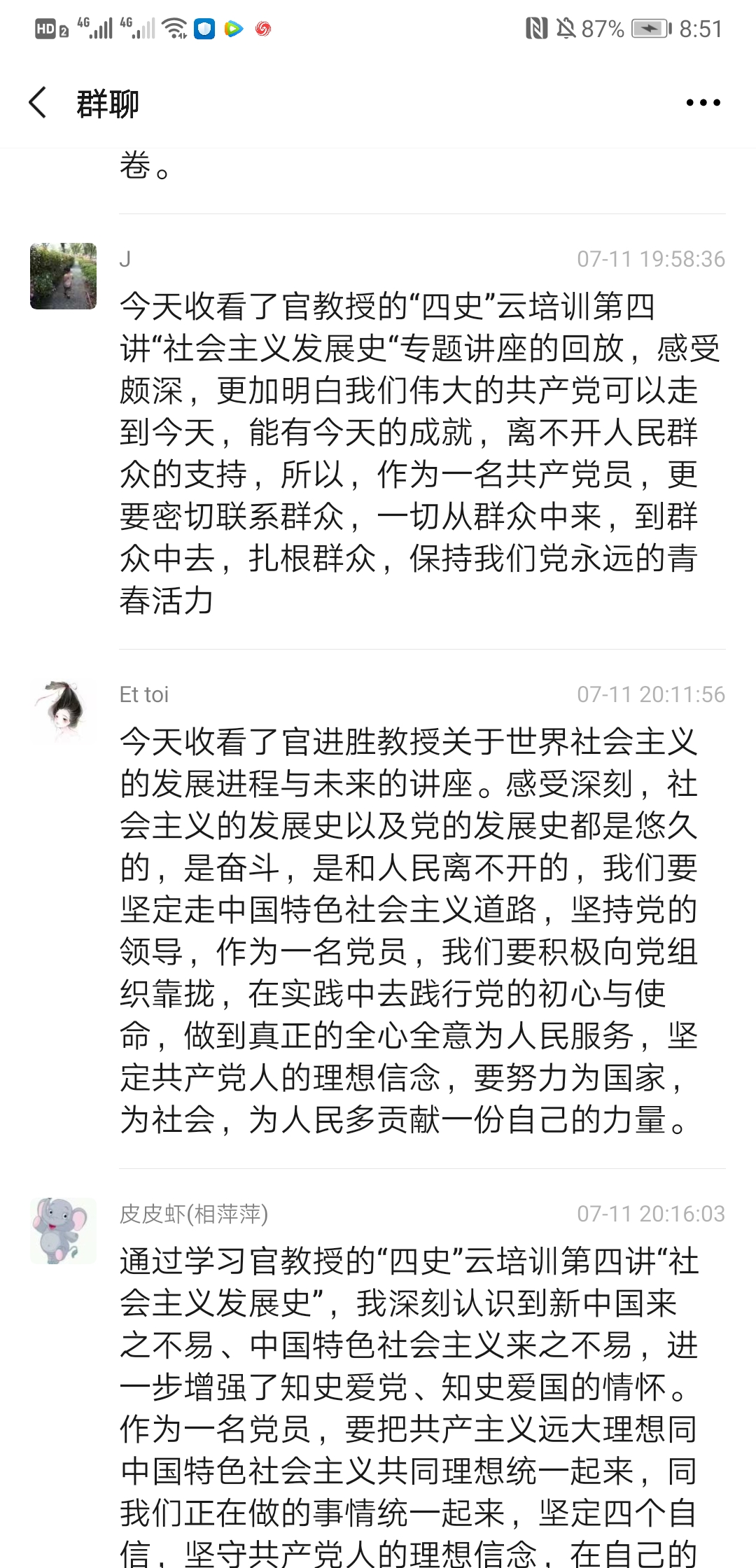 2020年7月10日上午9:30,上海民辦高校干部和黨員研修基地“四史”云培訓第四講“世界社會主義的發(fā)展進程與未來”專題講座準時開講,主講人是上海市委黨??茖W社會主義教研部主任官進勝教授。為加強師生黨員同志對社會主義發(fā)展史的認識和理解,公共衛(wèi)生與護理學院黨總支組織所有師生黨員收看了官教授的講座,并于11日晚19:00-20:00開展了一次線上研討會,共同探討本次講座的學習心得與體會,師生黨員同志們系統(tǒng)地回顧了世界社會主義的發(fā)展歷程,進一步加深了對社會發(fā)展規(guī)律的認識,增強了對中國走社會主義道路的決心和信心,對世界社會主義的美好前景充滿期待。以下是部分同志發(fā)言記錄: