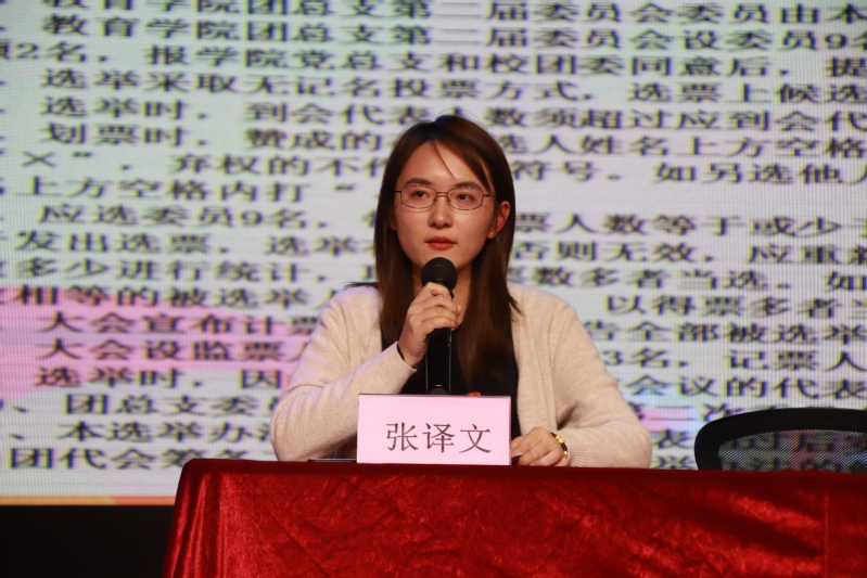 張譯文老師宣讀《教育學(xué)院團(tuán)總支第二屆委員會(huì)委員選舉辦法》,并經(jīng)舉手表決,一致通過(guò)。