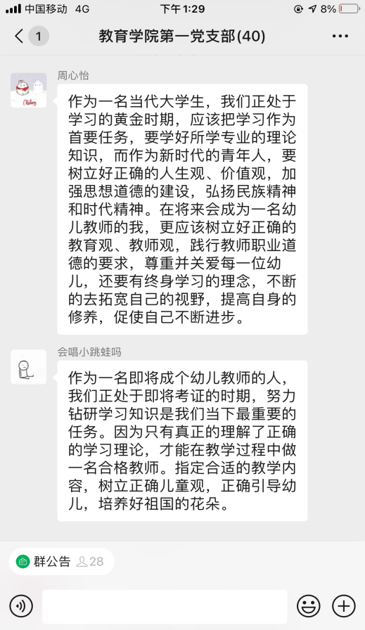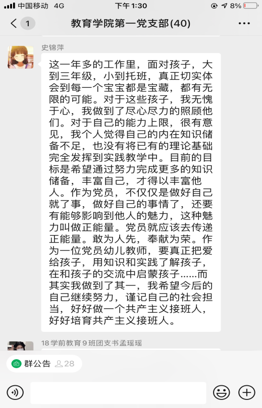 活動開始,黨總支副書記楊彥琛同志帶領(lǐng)全體黨員認(rèn)真學(xué)習(xí)《習(xí)近平談治國理政》第三卷第一章節(jié)“譜寫新時(shí)代中國特色社會主義新篇章”。大家圍繞堅(jiān)定文化自信,作為大學(xué)生黨員、黨員教師、幼兒教師,我們應(yīng)該怎么做;新時(shí)代要有新氣象,更要有新作為,作為青年人我們應(yīng)該在“兩個(gè)一百年”的歷史交匯期能做些什么兩個(gè)主題并結(jié)合自己的學(xué)習(xí)體會進(jìn)行了研討交流。