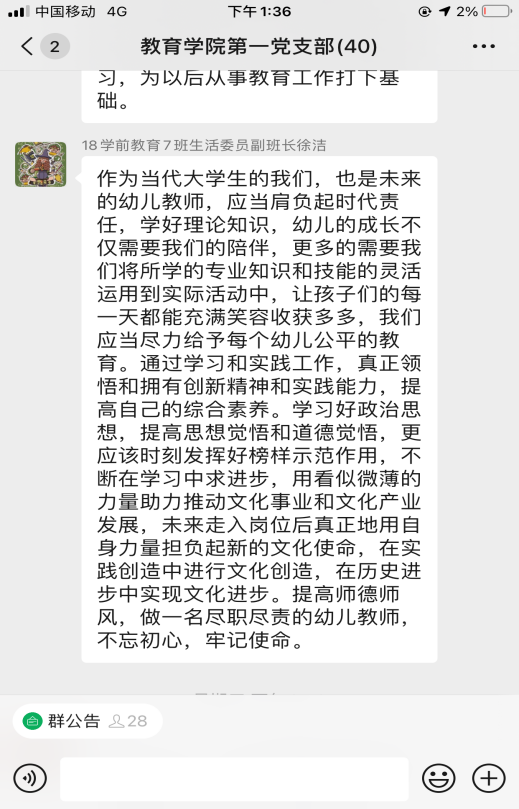作為人民教師,我們“胸懷兩個(gè)大局,做好自己的事情”,把“人民至上”作為工作的標(biāo)準(zhǔn),用耐心、愛心陪伴幼兒,讓幼兒在安全的環(huán)境下,形成好的學(xué)習(xí)習(xí)慣、生活習(xí)慣;設(shè)身處地站在家長的角度,分析問題,運(yùn)用自己的專業(yè)知識答疑解惑,做好家園合作,為建設(shè)新時(shí)代中國特色社會主義而不懈努力奮斗。