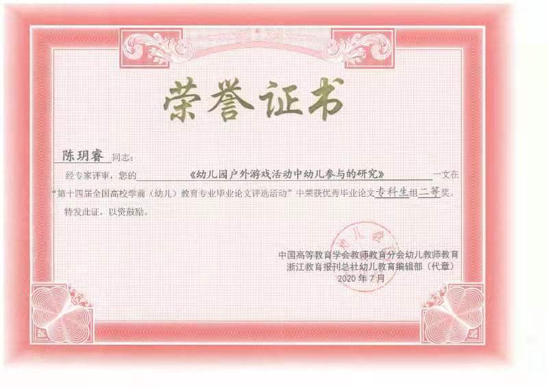 第十四屆全國高校學前(幼兒)教育專業(yè)優(yōu)秀畢業(yè)論文評選活動于2020年6月順利進行。經(jīng)過華東師范大學、南京師范大學、華南師范大學等高校專家盲審,我校17級學前教育專業(yè)2班陳玥睿同學的畢業(yè)論文《幼兒園戶外游戲活動中幼兒參與的研究》在全國800余所高校的1300余篇優(yōu)秀畢業(yè)論文中脫穎而出,榮獲??平M二等獎。
