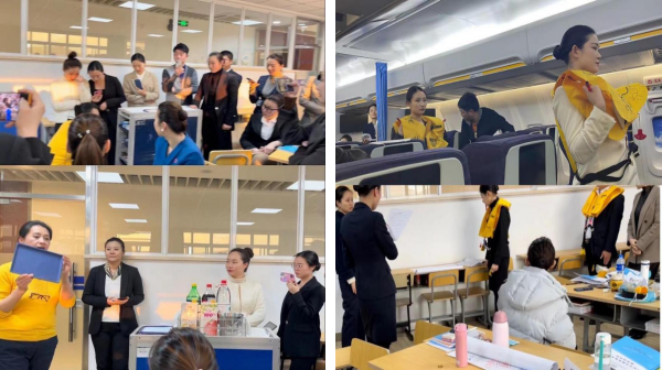 本次培訓(xùn)采用“理論+實(shí)踐”的培訓(xùn)模式。理論知識(shí)培訓(xùn)涵蓋空中乘務(wù)專業(yè)1+X政策解讀、中國民航發(fā)展史與乘務(wù)員教育思路、民航法介紹以及溝通技巧等模塊,有助于空乘專業(yè)的內(nèi)涵建設(shè),尤其是積極利用社會(huì)優(yōu)質(zhì)資源來提升、完善空乘學(xué)生實(shí)訓(xùn)教學(xué)環(huán)境。實(shí)踐環(huán)節(jié)更加貼近實(shí)際,如模擬艙服務(wù)、乘務(wù)職業(yè)形象、特殊旅客服務(wù)、模擬北京至上海航線服務(wù)程序、求生技巧等環(huán)節(jié),幫助老師更好地掌握民航空乘的專業(yè)技能。