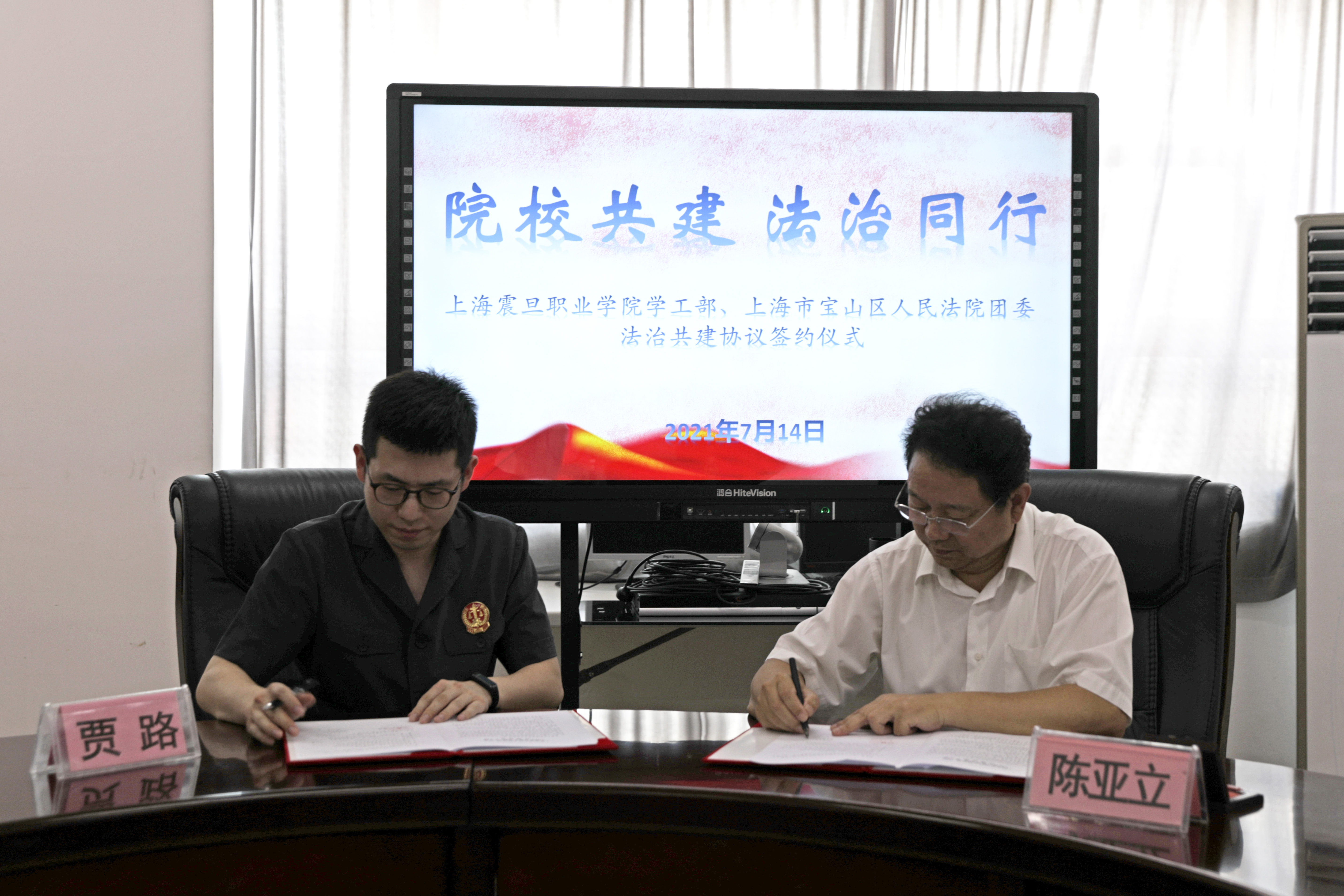 陳亞立部長與法院賈路法官分別代表雙方簽訂了共建協(xié)議。協(xié)議約定,院校雙方建立大學生社會實習實踐合作交流機制,法院定期提供實習生項目供我校學生參加,主要承擔法院通知、送達、歸檔等輔助性審判工作,組織學生參觀法院、旁聽庭審、法律實習、課題調(diào)研等,并舉辦普法教育和法律咨詢等活動,雙方相互配合,共同做好共建的履職與宣傳工作。