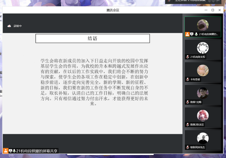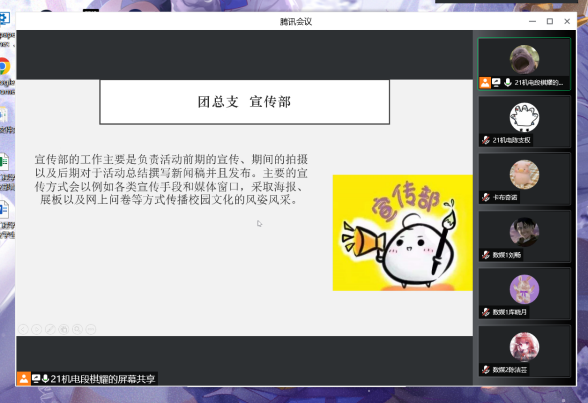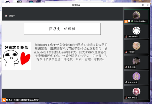 首先,主講人段棋耀同學對團總支學生會各部門作詳細的介紹,讓成員們對各部門的職責有了更深的認識。他指出本次培訓會議的目的是為了內(nèi)增素質(zhì)外樹形象,內(nèi)外兼修才能為廣大學生樹立良好的榜樣。新成員需要加強個人工作方面的技能,正確處理好部門間的關(guān)系,團隊協(xié)作,才能提高工作效率,更快融入團總支學生會這個大家庭,更好地為同學們服務。所有新成員輪流分享加入團總支學生會以來的感想。