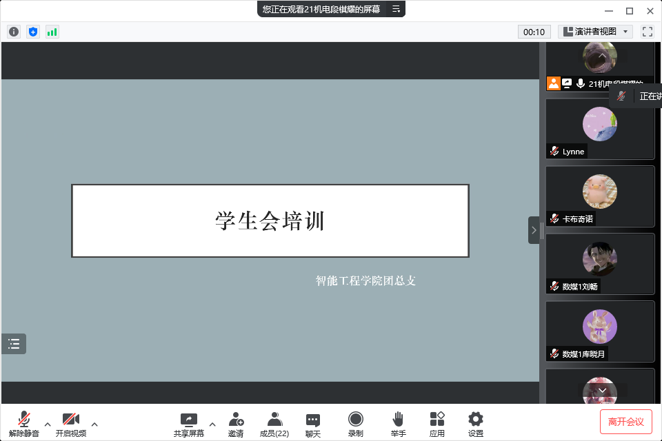 根據(jù)校學生會春季學期培訓部署安排,為做好換屆后的團總支學生會成員的培訓工作,幫助新成員進一步了解團總支學生會各部門的工作職責和內(nèi)容,2022年5月16日晚18點30分,智能工程學院2022年春季學期學生會組織培訓會(第一場)在騰訊會議召開。