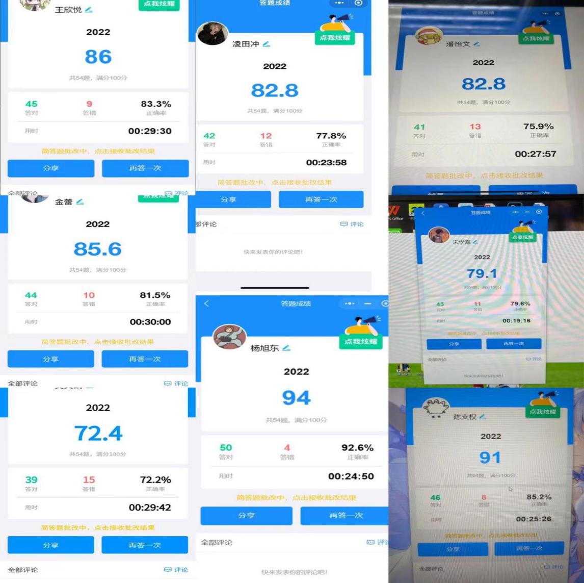 競賽當(dāng)天上午10點,負(fù)責(zé)人準(zhǔn)時下發(fā)競賽小程序二維碼,同學(xué)們立即進(jìn)入小程序,仔細(xì)思考認(rèn)真答題。競賽結(jié)束后,同學(xué)們積極交流本次活動的想法和感受,并分享了本次競賽的成績。秘書處統(tǒng)計參賽同學(xué)的成績,給予參賽同學(xué)表揚(yáng)與鼓勵,并為本次競賽前三名頒發(fā)榮譽(yù)獎狀。