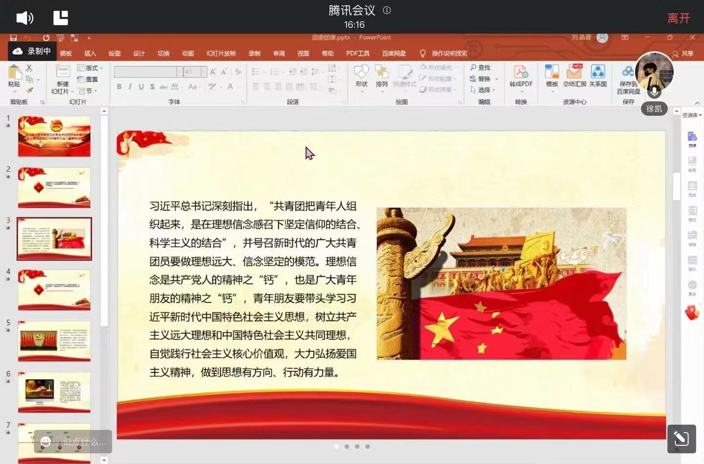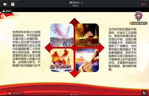 2022年5月27日下午19時(shí),20級(jí)數(shù)字媒體應(yīng)用技術(shù)1班在騰訊會(huì)議舉行了 “深入學(xué)習(xí)宣傳貫徹習(xí)近平總書(shū)記在慶祝中國(guó)共產(chǎn)主義青年團(tuán)成立100周年大會(huì)上重要講話(huà)精神”線(xiàn)上主題團(tuán)日班會(huì)活動(dòng)。輔導(dǎo)員徐凱老師出席會(huì)議,會(huì)議由團(tuán)支書(shū)劉晶蕾同學(xué)主持。