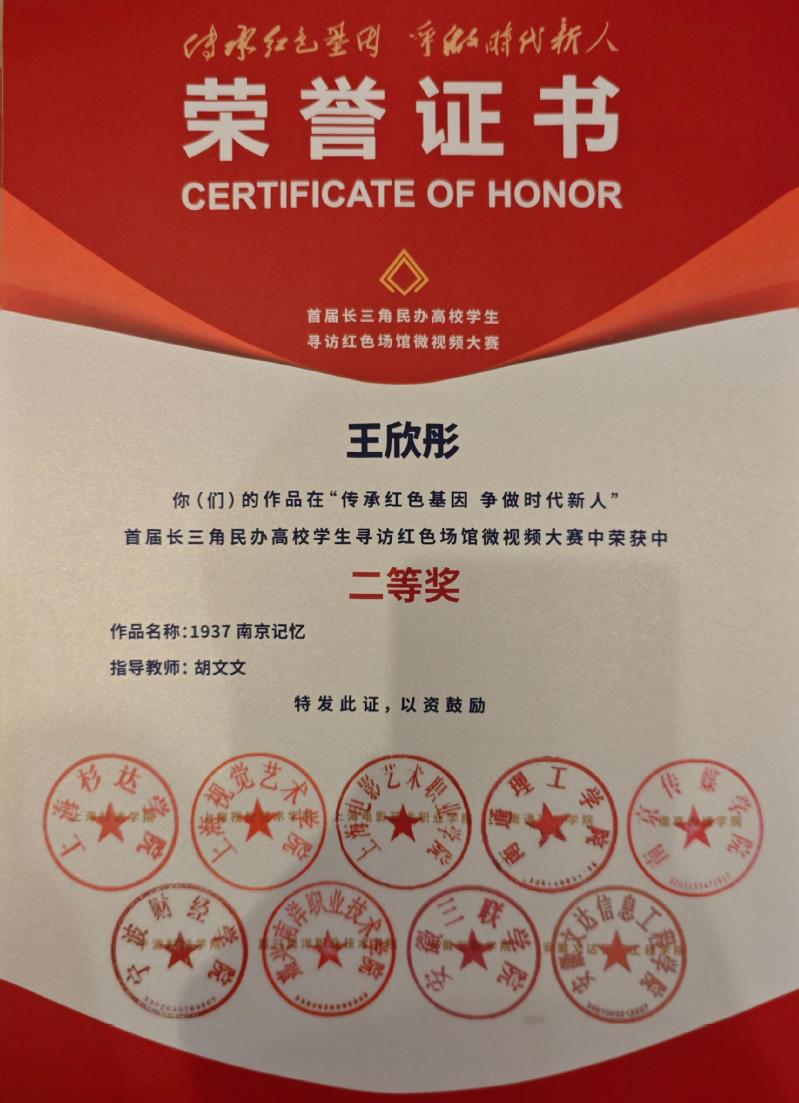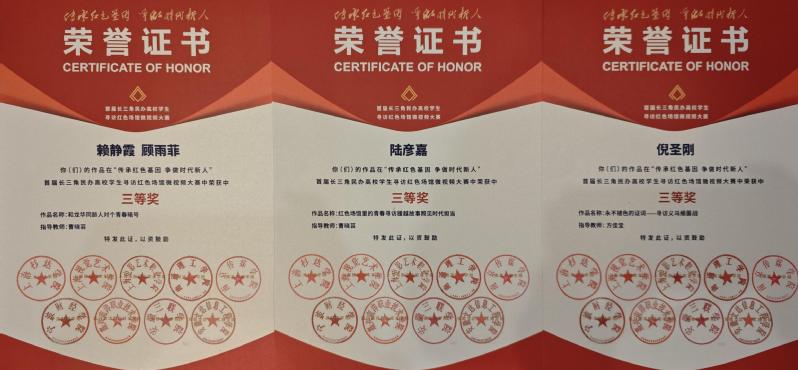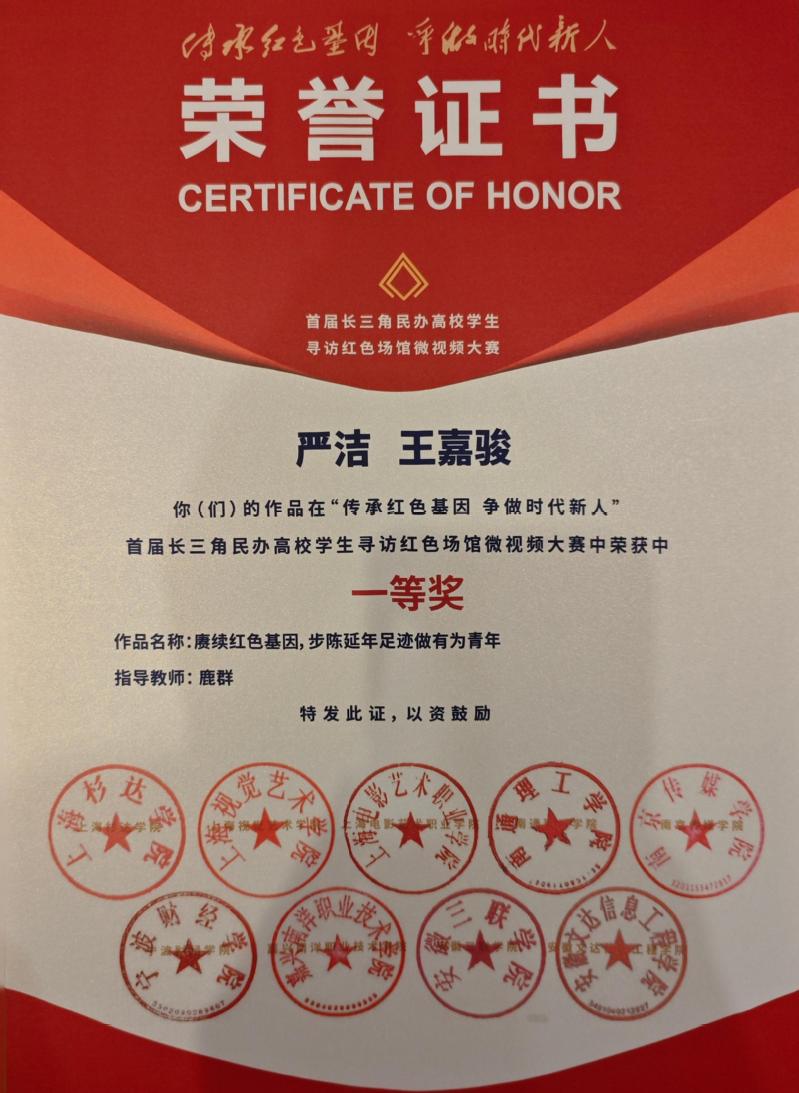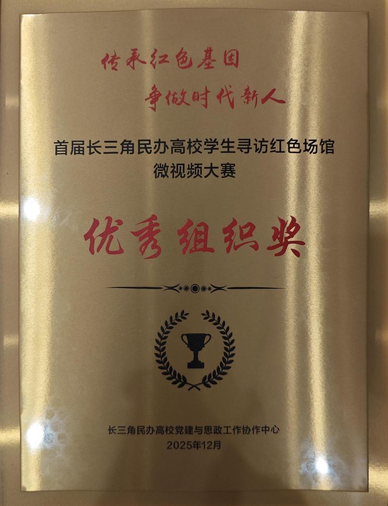 12月5日,“傳承紅色基因 爭(zhēng)做時(shí)代新人”首屆長(zhǎng)三角民辦高校學(xué)生尋訪紅色場(chǎng)館微視頻大賽頒獎(jiǎng)儀式在上海杉達(dá)學(xué)院金海校區(qū)舉行。我校學(xué)子喜獲多項(xiàng)榮譽(yù),其中嚴(yán)潔、王嘉駿同學(xué)創(chuàng)作的作品《賡續(xù)紅色基因,步陳延年足跡,做有為青年》榮獲一等獎(jiǎng)。我校榮獲“優(yōu)秀組織獎(jiǎng)”。