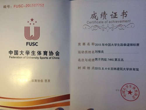 在校領(lǐng)導(dǎo)的大力支持和幫助下,我校跆拳道隊,作為全國唯一一所民辦高職院校出征2015全國大學(xué)生跆拳道錦標(biāo)賽,震旦的校旗首次在全國的體育賽場中飄揚(yáng)起來。我校代表選手劉惟良參加男子74KG組比賽獲全國第五名佳績,并因在比賽中帶重傷堅持而被組委會授予“體育道德風(fēng)尚運(yùn)動員”稱號。