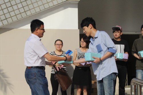 上午8點(diǎn),學(xué)生代表們?cè)缭缇驮诮虒W(xué)樓的門(mén)口等待老師們的到來(lái),為老師獻(xiàn)上祝福的禮物。筆筒貼上祝福的話語(yǔ),經(jīng)過(guò)同學(xué)們精心包裹,親手送給老師,禮輕卻情意重。老師們收到這些禮物的時(shí)候,都不由自主地流露出燦爛的笑容。