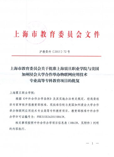 在全球經(jīng)濟一體化、科技與信息迅速發(fā)展的今天,國際化已經(jīng)成為教育發(fā)展的趨勢,也是我院職業(yè)教育適應(yīng)經(jīng)濟發(fā)展和國家“走出去”發(fā)展戰(zhàn)略的必然選擇。我院在董事長、院長和黨委書記的領(lǐng)導(dǎo)下,經(jīng)過杜飛龍院長具體指導(dǎo)和機電工程學(xué)院、國際交流處等有關(guān)部門領(lǐng)導(dǎo)和同仁的努力,積極申報上海震旦職業(yè)學(xué)院與美國加州浸會大學(xué)合作舉辦物聯(lián)網(wǎng)應(yīng)用技術(shù)專業(yè)高等??平逃椖?。在申報過程中學(xué)習(xí)其他高校辦學(xué)經(jīng)驗,與浸會大學(xué)溝通聯(lián)系,反復(fù)修改項目方案,終于在 2015年9月30日獲上海市教育委員會批準(zhǔn)和教育部核準(zhǔn)。中外合作辦學(xué)許可證編號為:PDE31US3A20150863N。