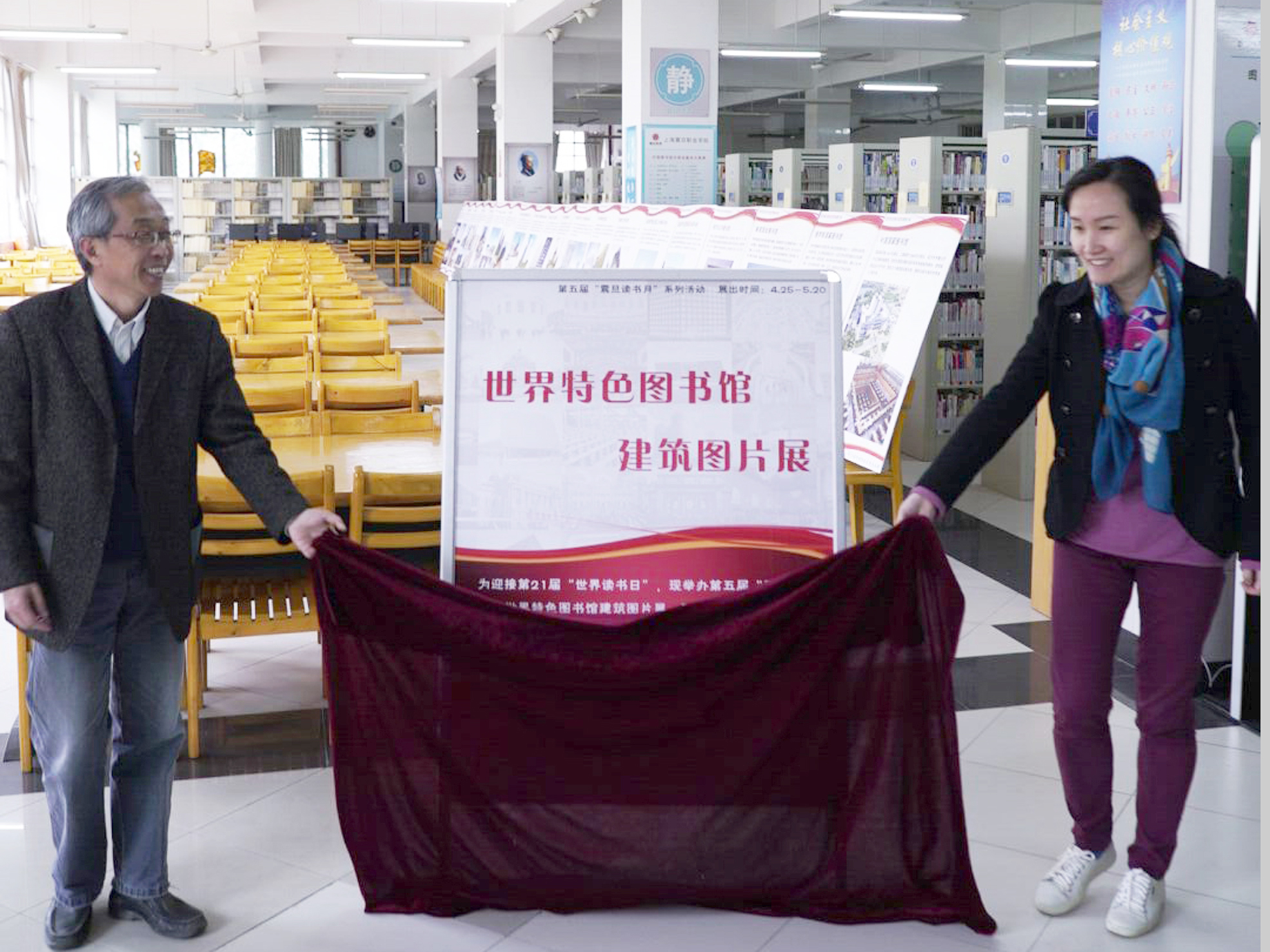 4月25日中午,第五屆“震旦讀書月”系列活動之“世界特色圖書館建筑圖片展”在圖書館閱覽室開幕,上海震旦教育集團張沈董事長、學(xué)院圖書館張健館長、信息中心金瑤副主任、圖書館代表及學(xué)生讀者參加了展覽揭幕儀式。