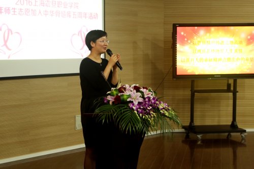 2016年6月3日上午9時,我院青年師生志愿者加入骨髓庫五周年活動在體藝樓實驗劇場舉行,寶山區(qū)紅會常務副會長朱琴老師、寶山區(qū)紅會副會長金培生老師、 共青團寶山區(qū)委員會書記孫蘭老師、羅店鎮(zhèn)紅會常務副會長陳祝標老師、共青團上海大學委員會副書記沈青松老師、共青團寶山區(qū)羅店鎮(zhèn)委員會書記鮑佩華老師、上海震旦教育發(fā)展基金會理事長張恵莉老師、上海震旦職業(yè)學院董事長張沈老師、上海震旦職業(yè)學院黨委書記黃晞建老師、上海震旦職業(yè)學院院長陳力華老師、上海震旦職業(yè)學院黨委副書記夏臻老師、上海震旦職業(yè)學院紅會副會長張佩莉老師出席了本次活動。