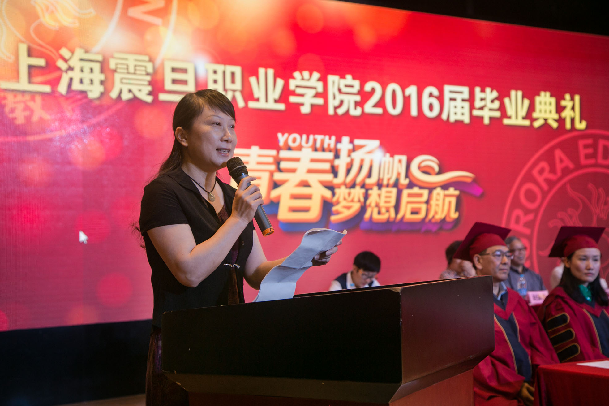 2016年6月13日上午9:00,我院2016屆畢業(yè)典禮在大禮堂召開。震旦教育基金會理事長張惠莉、名譽院長楊德廣、黃鼎業(yè)、學院董事長張沈、院長陳力華、黨委書記黃晞建、副書記夏臻、副院長劉彬、王純玉;以及各二級學院院長、黨總支書記、任課教師和畢業(yè)班輔導員參加了畢業(yè)典禮;上海市優(yōu)秀畢業(yè)生家長也應邀參加了畢業(yè)典禮。