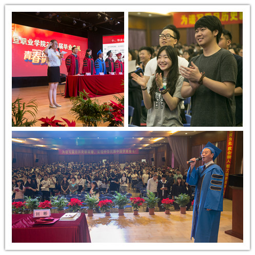 授證儀式后,在馬麗娜同學的領(lǐng)誓下,全體畢業(yè)生們集體宣誓:“牢記震旦校訓:崇尚科學,注重文藝,不講教理。忠于祖國、熱愛人民、用聰慧和才智奉獻社會,以品格和精神影響他人,實現(xiàn)成才報國的夢想,實現(xiàn)中華民族的偉大復興?!毙暮螅瑹崆楦邼q的畢業(yè)生在陳院長的帶領(lǐng)下高唱《畢業(yè)歌》,2016屆畢業(yè)典禮在