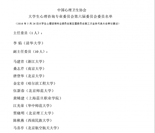 根據(jù)中國心理衛(wèi)生協(xié)會(huì)大學(xué)生心理咨詢專業(yè)委員會(huì)通知,5月26日在西安交通大學(xué)召開了大學(xué)生心理咨詢專業(yè)委員會(huì)第三次委員會(huì)議及會(huì)員代表大會(huì)進(jìn)行了換屆,來自全國188所高校的305名代表參會(huì),會(huì)議審議通過并報(bào)中國心理衛(wèi)生協(xié)會(huì)批準(zhǔn),我院黨委書記、上海市學(xué)校心理健康教育名師黃晞建同志擔(dān)任中國心理衛(wèi)生協(xié)會(huì)大學(xué)生心理咨詢專業(yè)委員會(huì)第六屆委員會(huì)副主任委員。