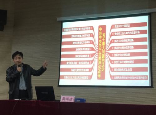 11月10日晚,學(xué)院黨委書記黃晞建教授為我院高級(jí)黨校學(xué)員做了《面向未來,你準(zhǔn)備好了嗎?》的主題報(bào)告。報(bào)告深入淺出的對(duì)十八大三、四、五、六中全會(huì)的邏輯關(guān)系進(jìn)行了講解,并結(jié)合中共中央關(guān)于全面深化改革若干問題的決定和"十三五"規(guī)劃綱要草案中的民生看點(diǎn),從生育政策、教育改革、就業(yè)創(chuàng)業(yè)、城鄉(xiāng)統(tǒng)一的建設(shè)用地、醫(yī)療保障制度、國家產(chǎn)權(quán)保障體制改革等方面進(jìn)行了分析,學(xué)員們受益匪淺。