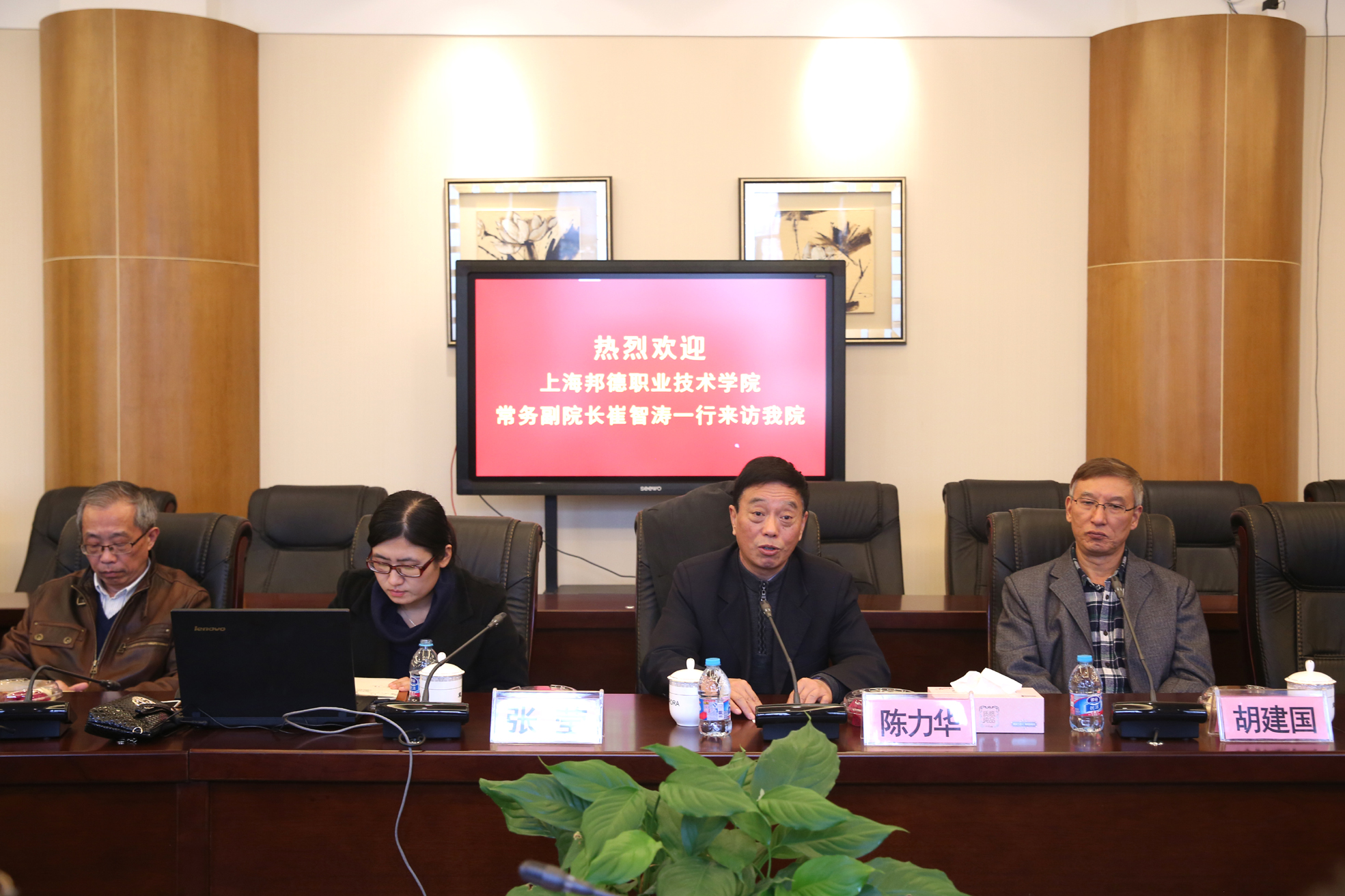 12月7日,上海邦德職業(yè)技術(shù)學(xué)院常務(wù)副院長崔智濤、教務(wù)科研處處長姚永敬、教務(wù)科研處副處長李金河、信息中心主任助理孫崢、后保處蔡柳青老師等一行來我院考察交流,我院院長陳力華、院辦副主任羅英姿、教務(wù)處副處長張瑩、督導(dǎo)辦主任胡建國、圖文信息中心主任張健在體藝樓國際會議中心參加接見并陪同座談。