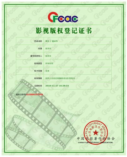 由東方電影學(xué)院副院長(zhǎng)祝華東老師根據(jù)我國(guó)著名電影表演藝術(shù)家秦怡人生經(jīng)歷、藝術(shù)生涯創(chuàng)作的電影文學(xué)劇本《秦怡》,日前獲得中國(guó)電影著作權(quán)協(xié)會(huì)頒發(fā)的《影視版權(quán)登記證書》(版權(quán)注冊(cè)號(hào)碼610000197366)。