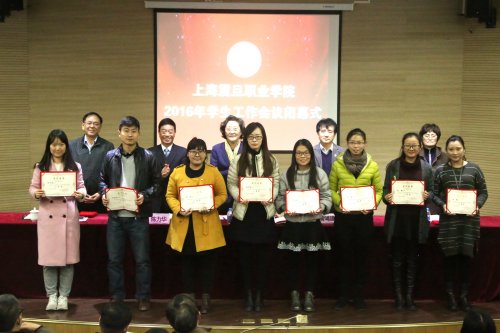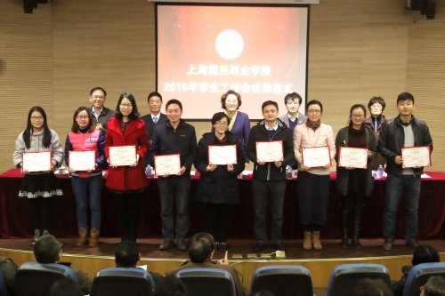 在2016年上海震旦職業(yè)學(xué)院學(xué)生工作閉幕式上,校領(lǐng)導(dǎo)為獲獎(jiǎng)人員授獎(jiǎng)。