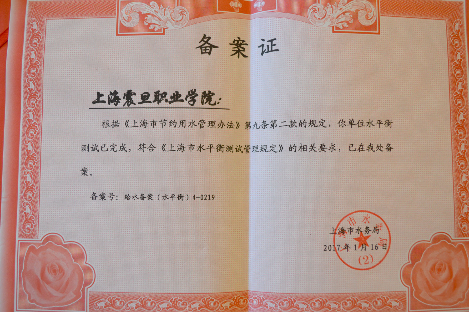 上海市水務(wù)局對(duì)我院在創(chuàng)建節(jié)水型校區(qū)活動(dòng)中的水平衡測(cè)試工作給予肯定,并當(dāng)場(chǎng)向我院頒發(fā)《水平衡測(cè)試達(dá)標(biāo)備案證》。