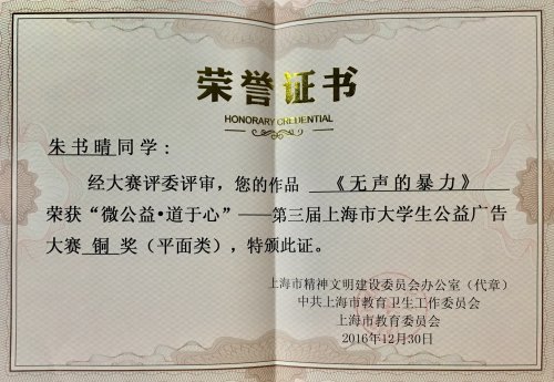 第三屆“微公益,道于心”上海市大學(xué)生公益廣告大賽從2016年3月開(kāi)始,歷時(shí)數(shù)月,到12月份圓滿結(jié)束,這次活動(dòng)在各高校開(kāi)展的如火如荼。最終120幅作品從2000多份作品中脫穎而出。我傳媒藝術(shù)學(xué)院14級(jí)廣告設(shè)計(jì)與制作專業(yè)朱書(shū)晴同學(xué)以“遠(yuǎn)離暴力”為主題思想,精心創(chuàng)作設(shè)計(jì)的《無(wú)聲的暴力》公益海報(bào),在此次大賽中榮獲銅獎(jiǎng)。