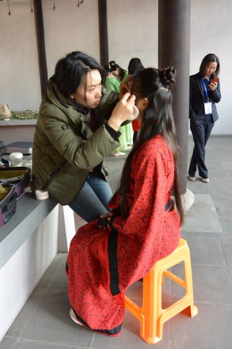 早上六點半,十二位小花仙們就從學(xué)校出發(fā)前往花神廟進行巡演前的化妝與最后彩排。九點半,祈福儀式結(jié)束后,我們的震旦花仙們與漢未央的12位花仙共同組成了24花仙,跟隨花神身后,參與了本次的巡演活動,姑娘們驚艷的打扮引來了眾多的贊美聲和不少攝像師們的圍拍。此外我校43名志愿者也參與到本次花神節(jié)活動中,和工作人員們一起維護花神堂和龍船廣場秩序,指引觀眾們有序進場、觀看演出。