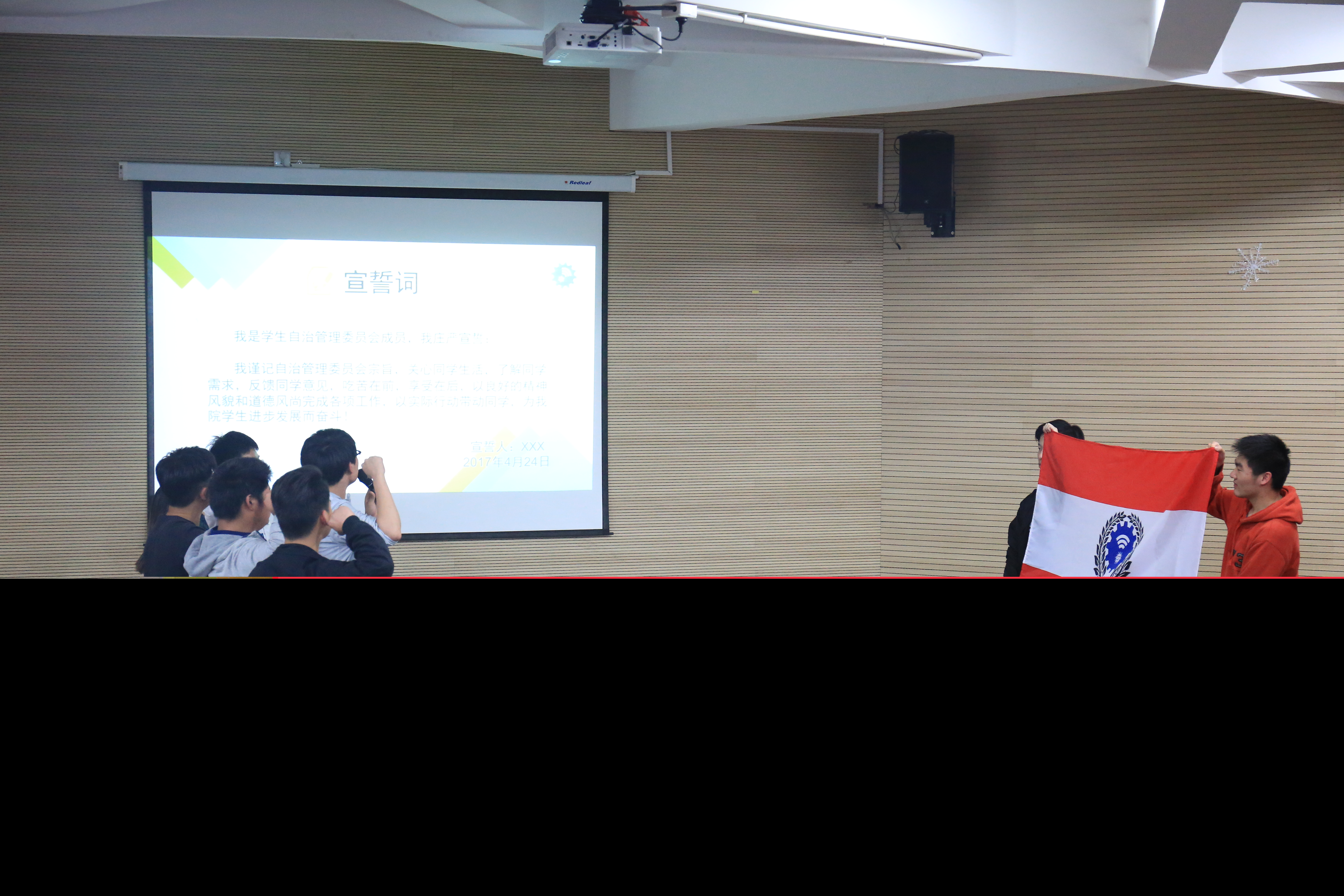 會上學(xué)生上演了自編自演的相聲,生動展示了學(xué)生自管會的工作情況和迫切想?yún)⒓幼怨軙男那?。大會以無計(jì)名投票選出4名部長,并由院團(tuán)總支書記武俠老師宣布選舉結(jié)果。在熱烈的掌聲中,由各位領(lǐng)導(dǎo)向剛當(dāng)選的會長、副會長和部長授徽,6名成員并面對會旗進(jìn)行了莊嚴(yán)的宣誓。接著曹哲駿同學(xué)結(jié)合自身的工作實(shí)踐,談了如何做一名優(yōu)秀干部,發(fā)揮先鋒模范作用,帶領(lǐng)大家一起進(jìn)步的心得體會。并表示在未來工作學(xué)習(xí)中會更加的努力,不斷完善自己。