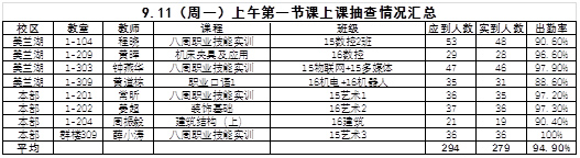 9月11日上午2017-2018學(xué)年第一學(xué)期正式開學(xué),清晨,領(lǐng)導(dǎo)和老師們就早早地來到了學(xué)校做開學(xué)的準(zhǔn)備工作,迎接新老同學(xué)入學(xué);2015級、2016級的同學(xué)們也是早早地等候在教室,等待8.30分正式開課。8.20分學(xué)校和有關(guān)部處領(lǐng)導(dǎo)們就聚集在會議室,鈴響后張理事長、張沈董事長、陳校長、黃書記、夏書記就帶領(lǐng)有關(guān)部處領(lǐng)導(dǎo),分四路深入校本部和美蘭湖校區(qū),到教室、實(shí)驗(yàn)室檢查開學(xué)第一節(jié)課的上課情況,從檢查的結(jié)果來看,總體上教學(xué)秩序井然、課堂紀(jì)律良好,老師負(fù)責(zé),學(xué)生認(rèn)真,比上學(xué)期有顯著進(jìn)步。具體體現(xiàn)在一是老師們?nèi)跍?zhǔn)時(shí)上崗,備課充分、認(rèn)真施教,沒有發(fā)現(xiàn)老師遲到等違紀(jì)現(xiàn)象;二是學(xué)生們經(jīng)過一個(gè)暑假的休息調(diào)整,精神面貌煥然一新,出勤率及紀(jì)律都比上學(xué)期有明顯提高,平均出勤率在94.9%(詳見下表);