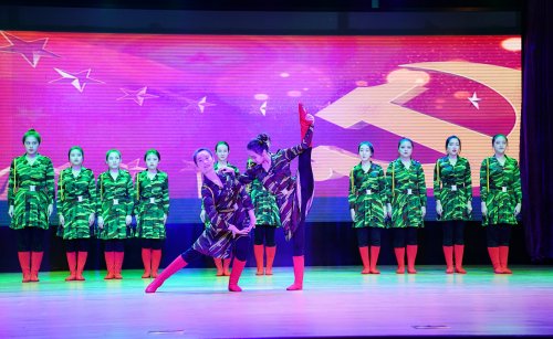 音樂舞蹈中心帶來的舞蹈《紅色贊歌》拉開了晚會(huì)的序幕。表演者們身穿迷彩服,迎著變換的燈光,那抹好似圣潔之光的綠色照進(jìn)每一位震旦人的心,旋轉(zhuǎn)、跳躍,昂首挺胸的身姿踏著音樂的旋律,曼妙的肢體譜寫生命的律動(dòng)之美,和諧之韻,舞出了對(duì)中國共產(chǎn)黨的深深敬意。