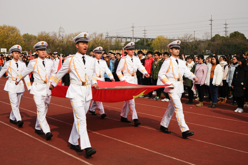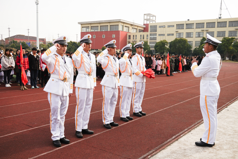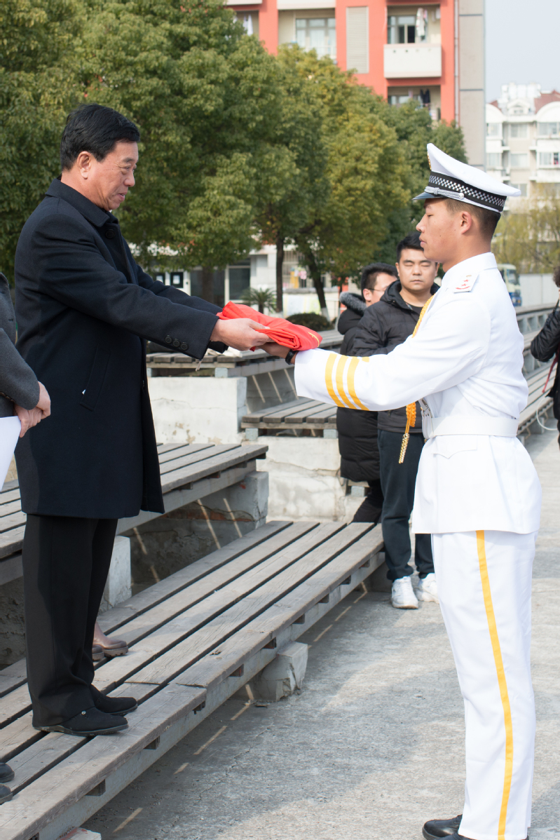 在徐磊老師宣布本屆軍訓(xùn)營結(jié)營式開始后,毛燕靜老師宣讀了關(guān)于我校國旗班成立的決定。校長陳力華莊重地向國旗班授旗,國旗班班長梁喻豪接過國旗,并進(jìn)行了莊嚴(yán)地宣誓:“護(hù)衛(wèi)國旗,重于生命”。緊接著,英姿颯爽的國旗班成員們護(hù)衛(wèi)五星紅旗,踏著堅(jiān)定的步伐走向升旗臺,全場肅靜,升國旗,奏國歌。