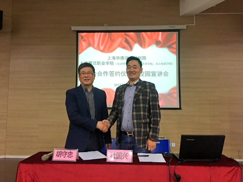 本次活動(dòng)由實(shí)踐教學(xué)辦公室主任葉素梅主持,經(jīng)濟(jì)管理學(xué)院胡守忠院長,傳媒藝術(shù)學(xué)院張繼平院長,東方電影學(xué)院祝華東副院長及華德集團(tuán)陳江總裁,華德河?xùn)|科創(chuàng)園杜國興園長等參加了活動(dòng)并現(xiàn)場(chǎng)簽訂合作協(xié)議。葉素梅主任代表學(xué)校授予華德科創(chuàng)園“上海震旦職業(yè)學(xué)院實(shí)訓(xùn)基地”銅牌。
