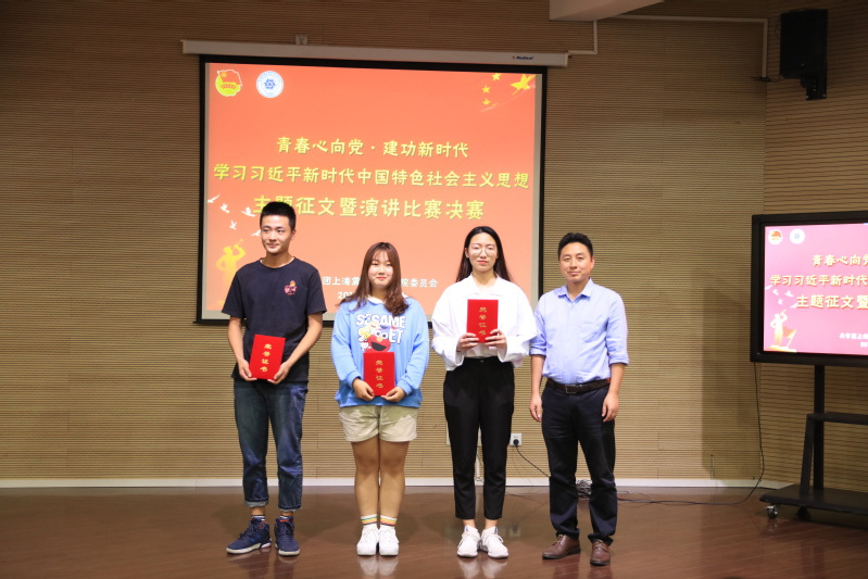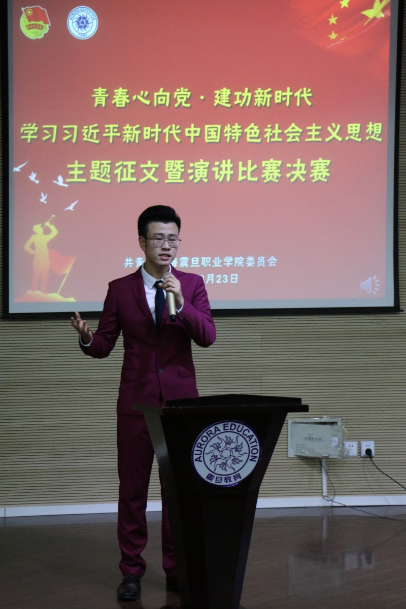 為隆重慶祝中華人民共和國成立70周年,深入學(xué)習(xí)貫徹習(xí)近平新時代中國特色社會主義思想,充分激發(fā)大學(xué)生的愛國熱情,廣泛凝聚青春力量。我校于2019年9月24日下午4點30分在體藝樓報告廳隆重舉行“青春心向黨·建功新時代”——上海震旦職業(yè)學(xué)院團(tuán)員青年學(xué)習(xí)習(xí)近平新的代中國特色社會主義思想主題征文暨演講比賽決賽。出席本次比賽的評委老師有:校黨委副書記夏臻老師、校馬克思主義學(xué)院副院長、思政部教學(xué)部主任魯學(xué)軍老師、校黨委辦公室主任張軍勝老師、校團(tuán)委書記曹曉莉老師、校團(tuán)委副書記邵慧老師。