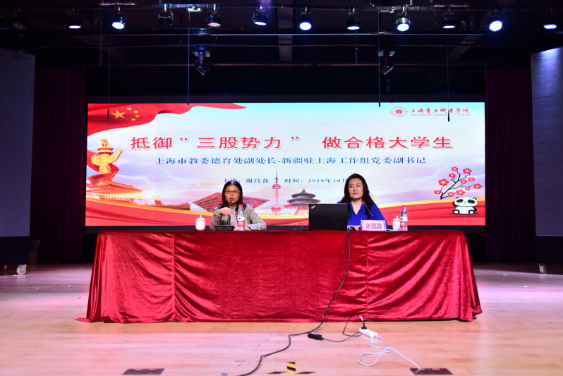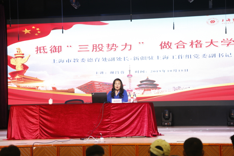 2019年10月18日下午,上海市教委德育處副處長、新疆駐上海工作組黨委副書記謝昌蓉在我校大禮堂,為2019級新疆籍學生做了一場題為“抵御‘三股勢力’,做合格大學生”的精彩講座。本次講座由上海震旦職業(yè)學院學生處處長毛燕靜主持,上海震旦職業(yè)學院全體2019級新疆籍學生、2019級輔導員老師參加。
