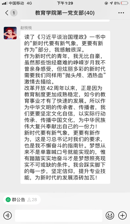 活動開始,黨總支副書記楊彥琛同志帶領(lǐng)全體黨員認真學(xué)習(xí)《習(xí)近平談治國理政》第三卷第一章節(jié)“譜寫新時代中國特色社會主義新篇章”。大家圍繞堅定文化自信,作為大學(xué)生黨員、黨員教師、幼兒教師,我們應(yīng)該怎么做;新時代要有新氣象,更要有新作為,作為青年人我們應(yīng)該在“兩個一百年”的歷史交匯期能做些什么兩個主題并結(jié)合自己的學(xué)習(xí)體會進行了研討交流。