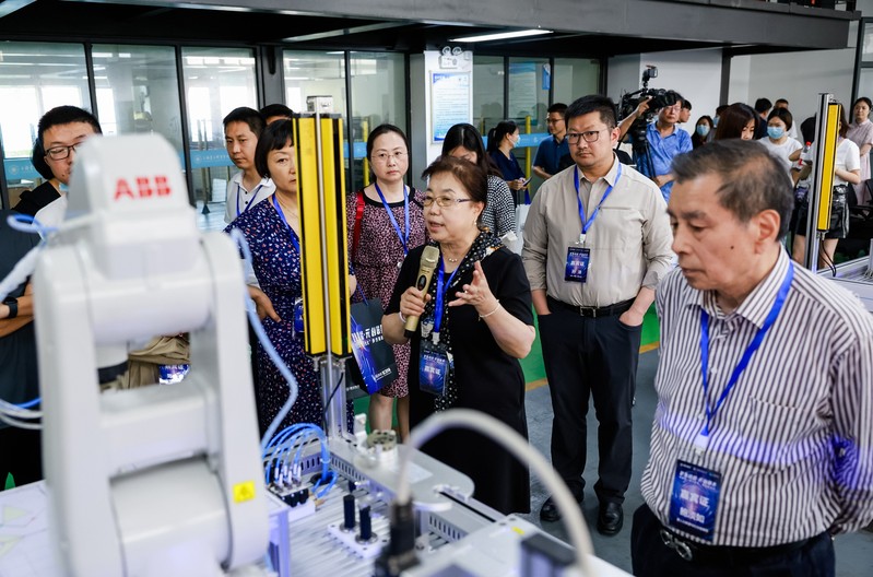 此次大會設(shè)置兩個分會場,第一分會場為智能工程產(chǎn)業(yè)學(xué)院教學(xué)改革成果展示會,向各位嘉賓介紹了智能產(chǎn)業(yè)學(xué)院基地機器人,舉行了中華人民共和國教育部“互聯(lián)網(wǎng)+中國制造2025促進計劃項目”ABB實驗實訓(xùn)與創(chuàng)新基地落成揭牌儀式,智能工程與元宇宙新技術(shù)校企合作-多方合作進行圓桌交流溝通。