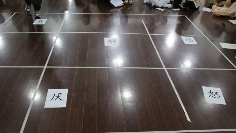 活動的第二部分,由輔導老師選取一個在大學生活中比較常見的宿舍矛盾問題為切入點,讓一組同學進入角色扮演,分別代表喜、怒、恐、哀、趣五種情緒狀態(tài),其他同學進行觀察記錄。借助不同顏色代表不同情緒狀態(tài)的披風,參與角色扮演的同學自編自導自演,將宿舍矛盾產(chǎn)生的過程及每個同學的內(nèi)部心理活動展示出來。