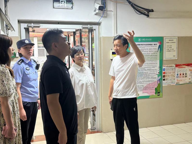 為切實加強(qiáng)安全防范工作,堅決遏制重特大校園安全事故發(fā)生,筑牢校園安全防線,確保學(xué)校暑假輪休工作的安全穩(wěn)定。7月14日下午,校黨委副書記夏臻、駐校民警金曉丹、保衛(wèi)處處長徐磊、后勤保障處副處長嚴(yán)永兵及保衛(wèi)處相關(guān)人員對校園重點區(qū)域進(jìn)行了安全大檢查。