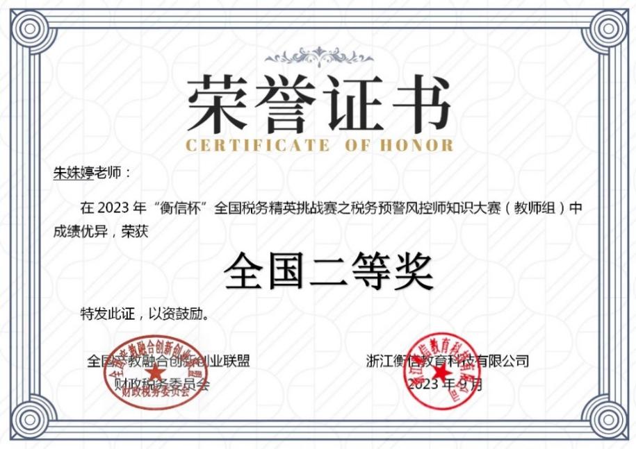 由全國產(chǎn)教融合創(chuàng)新創(chuàng)業(yè)聯(lián)盟財政稅務(wù)委員會和浙江衡信教育科技有限公司聯(lián)合主辦的“衡信杯”全國稅務(wù)精英挑戰(zhàn)賽于8月29日結(jié)束,我校經(jīng)濟管理學院朱姝婷老師喜獲全國二等獎。
