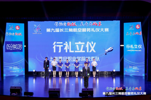本次大賽分為四個環(huán)節(jié),第一個環(huán)節(jié)是“行禮立儀”。選手需集體展示航空基礎禮儀。賽場上,震旦學子們以自信和嫻熟的動作展示出航空服務的專業(yè)性和高標準。