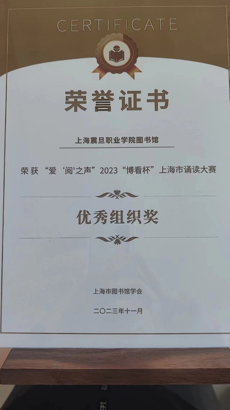 為進(jìn)一步推進(jìn)上海市文化建設(shè),鼓勵(lì)廣大市民讀者和在校大學(xué)生多讀書、讀好書、勤思考,從讀書中汲取力量與智慧,提高自身文化素質(zhì),形成人人讀好書、人人好讀書的終身學(xué)習(xí)目標(biāo),由上海市圖書館學(xué)會閱讀推廣委員會主辦,上海市圖書館學(xué)會新媒體閱讀推廣委員會、博看網(wǎng)共同承辦,上海市各參賽高校圖書館及公共圖書館共同參辦的“愛‘閱’之聲”2023“博看杯”上海市誦讀大賽落下帷幕。我校圖書館榮獲優(yōu)秀組織獎,圖書館劉圣德老師獲得“優(yōu)秀領(lǐng)隊(duì)”稱號。