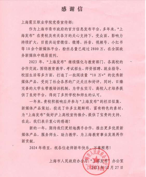 2023年12月27日,市政府辦公廳“上海發(fā)布”辦公室發(fā)來《感謝信》。信中提到,2023年,我校積極響應并參與“上海發(fā)布”的欄目征集、新媒體產(chǎn)品策劃,投送了許多主題鮮明、富有特色的素材,為“上海發(fā)布”做好滬上高校宣傳推介提供了寶貴的支持。揮手告別2023,未來的日子里,我們將繼續(xù)積極主動、通力合作,講好震旦故事,傳遞震旦聲音,助力上海教育事業(yè)發(fā)展。