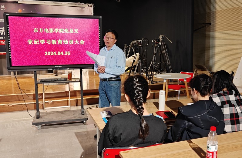 4月26日下午,東方電影學院黨總支在演播廳召開黨紀學習教育動員會,學院全體師生黨員、入黨積極分子參會。黨總支書記、副院長祝華東主持會議并作動員講話。