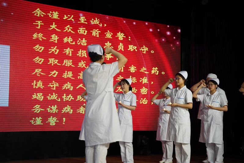 蔣心亞校長(zhǎng)致辭,她殷切表達(dá)了對(duì)護(hù)理專業(yè)學(xué)生的關(guān)愛與期望,激勵(lì)同學(xué)們加強(qiáng)專業(yè)技術(shù)的訓(xùn)練,提高護(hù)理臨床的綜合素質(zhì),繼承和發(fā)揚(yáng)不畏艱險(xiǎn)、甘于奉獻(xiàn)、救死扶傷、勇于獻(xiàn)身的人道主義精神。