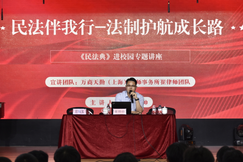 為深入學習貫徹習近平法治思想,落實總書記“讓民法典走到群眾身邊、走進群眾心里”的重要指示精神,近日,上海震旦職業(yè)學院邀請萬商天勤(上海)律師事務所合伙人崔帥帥律師進校開展《民法伴我行-法制護航成長路》專題講座,為全校師生上了一堂精彩生動的普法課。講座由副校長王純玉主持。